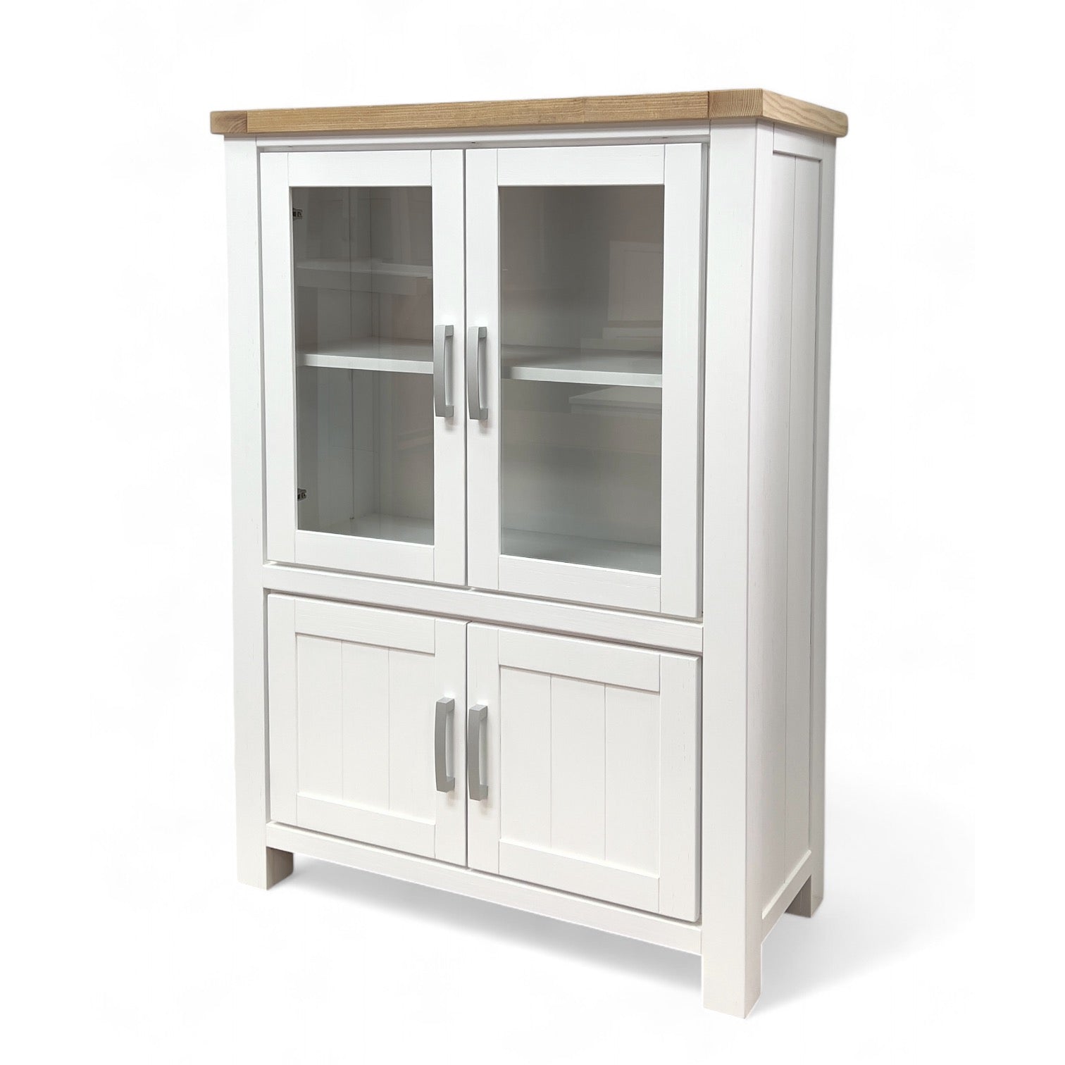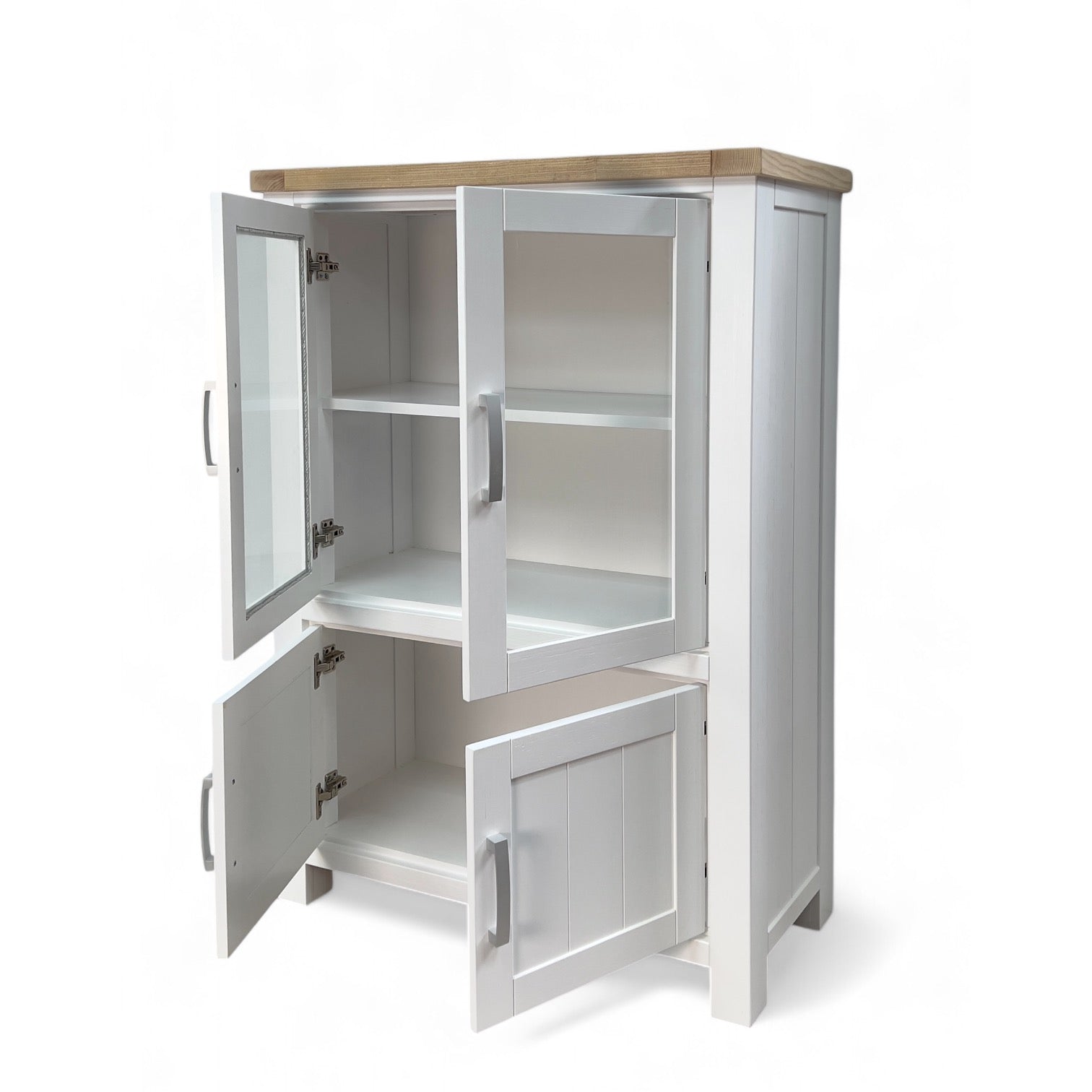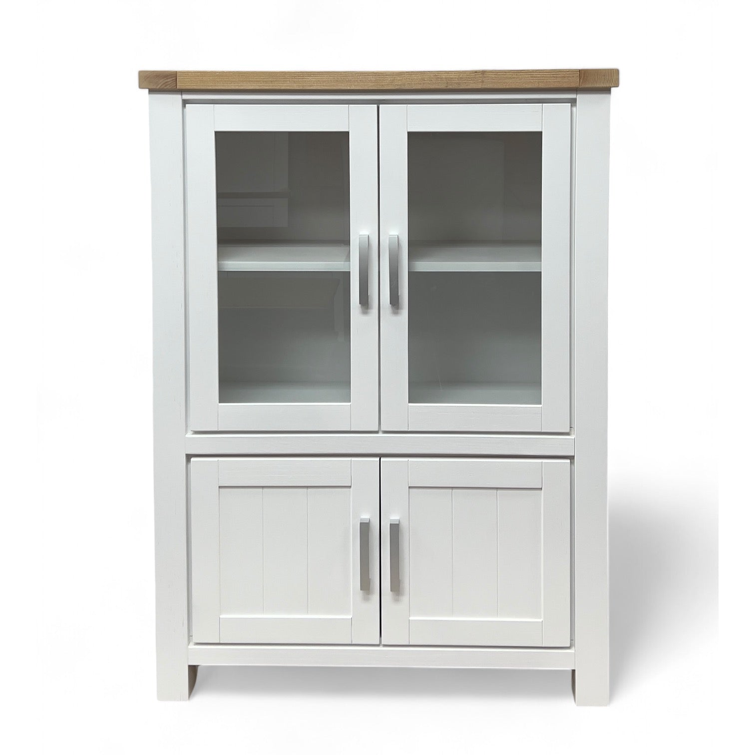 The Sicily Small Display Cabinet is designed for homes that want to balance display and storage in one compact piece. Its clean white frame, paired with a natural wood top, gives a fresh yet timeless look that blends seamlessly with coastal, country, or transitional interiors.