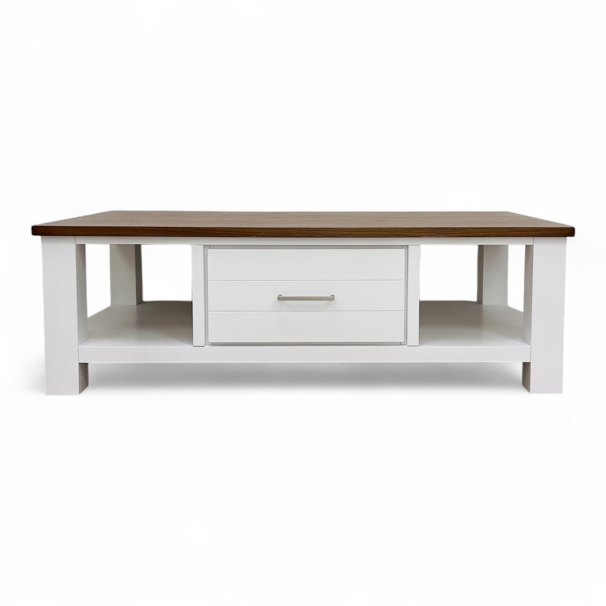 The Walton 1-Drawer Coffee Table brings practical living-room storage together with timeless farmhouse-inspired style. Crafted with a solid white pine frame featuring a brushed wood texture and topped with a walnut-stained solid rubber wood surface, it offers both functionality and warmth. The combination of a central drawer and open shelving makes it ideal for keeping your lounge tidy and organised, while the elegant two-tone design blends effortlessly with modern or classic décor.