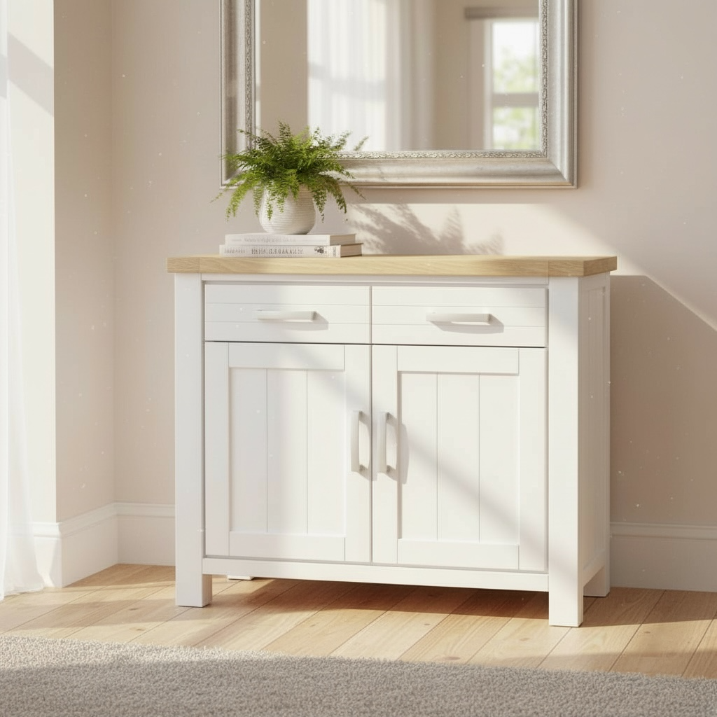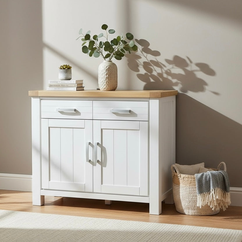 Bring a touch of rustic charm to your home with the Sicily Small Buffet, designed in a modern farmhouse style. Crafted from white pine with a brushed wood grain finish and paired with a natural ash wood top, this piece blends warmth and practicality in one compact cabinet.
