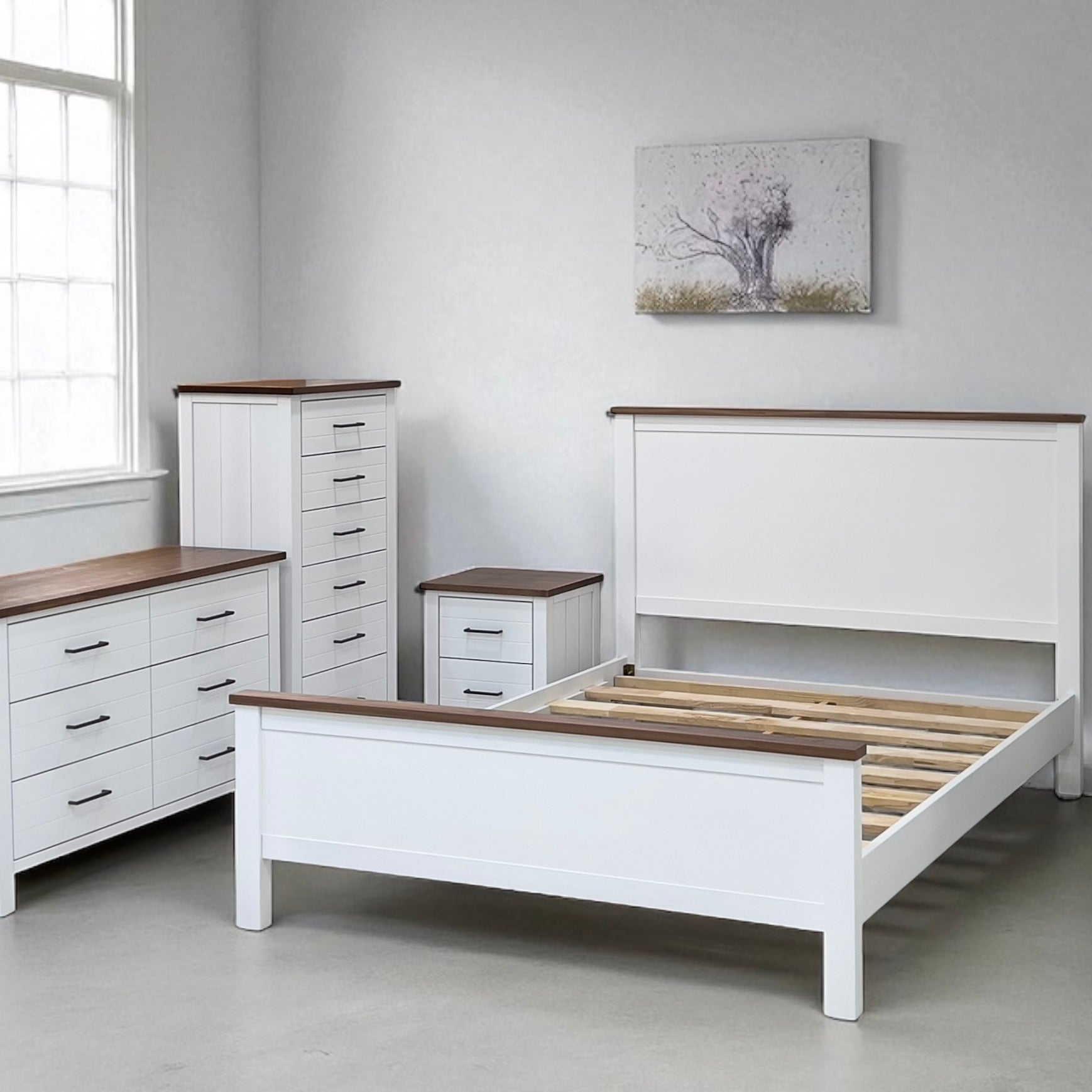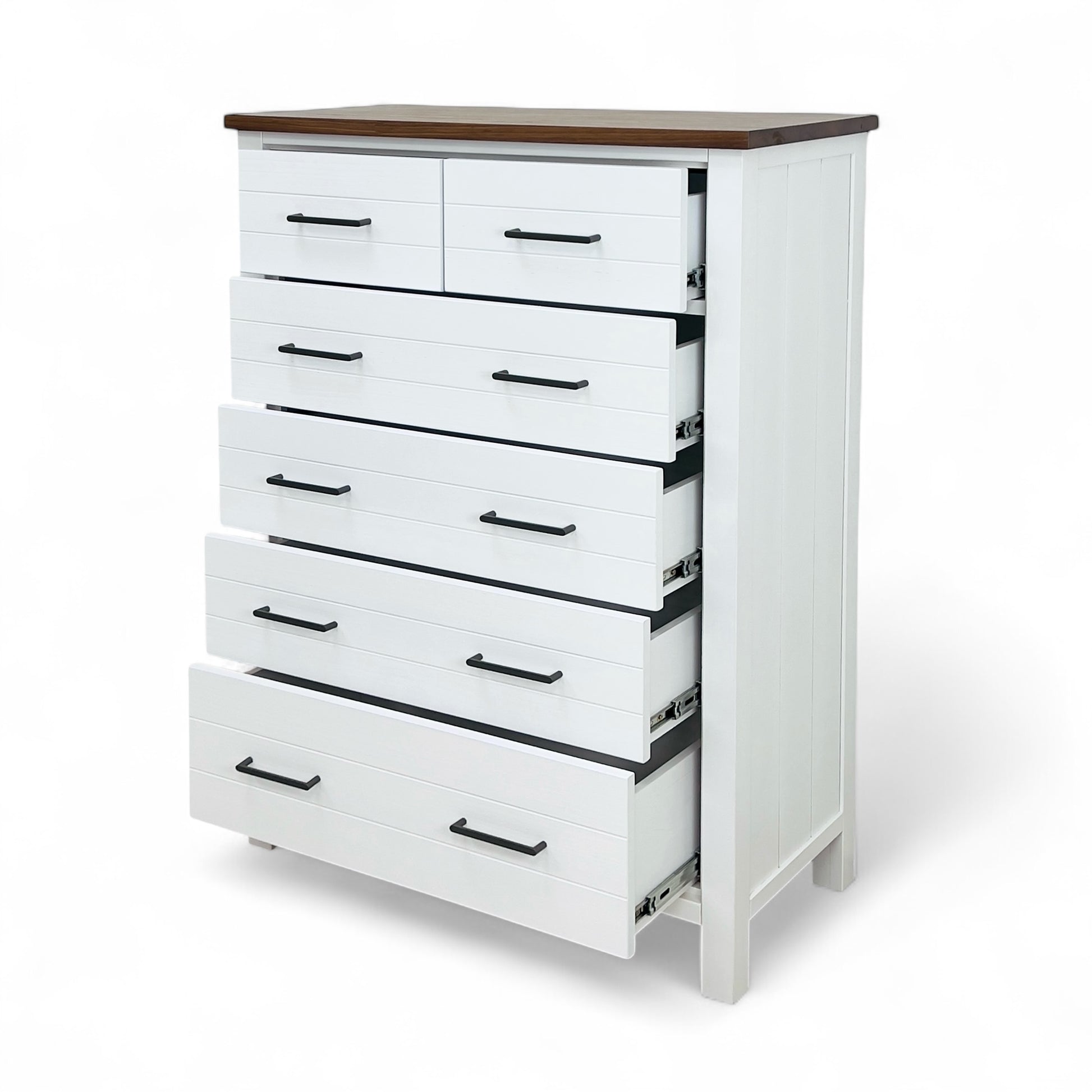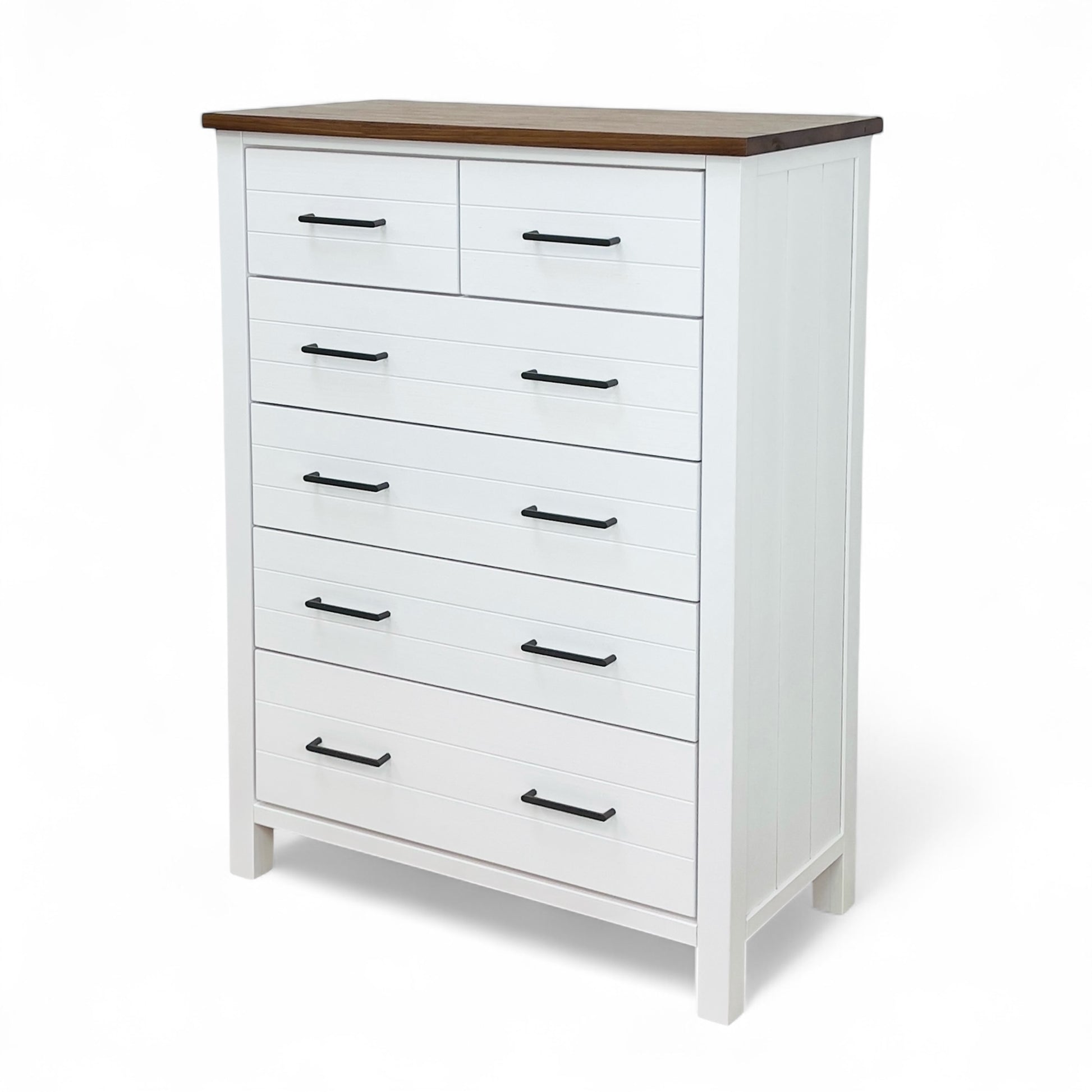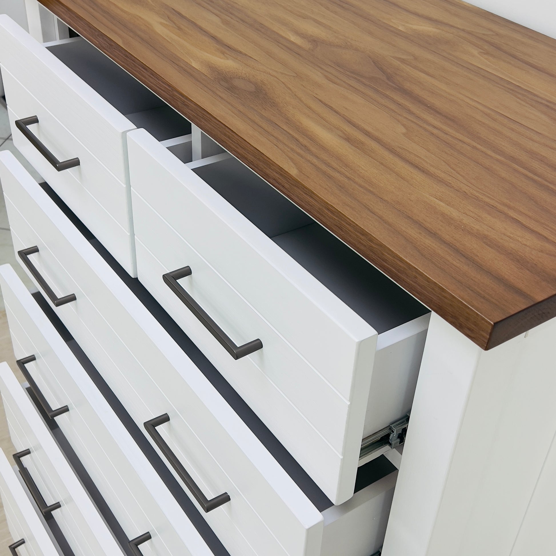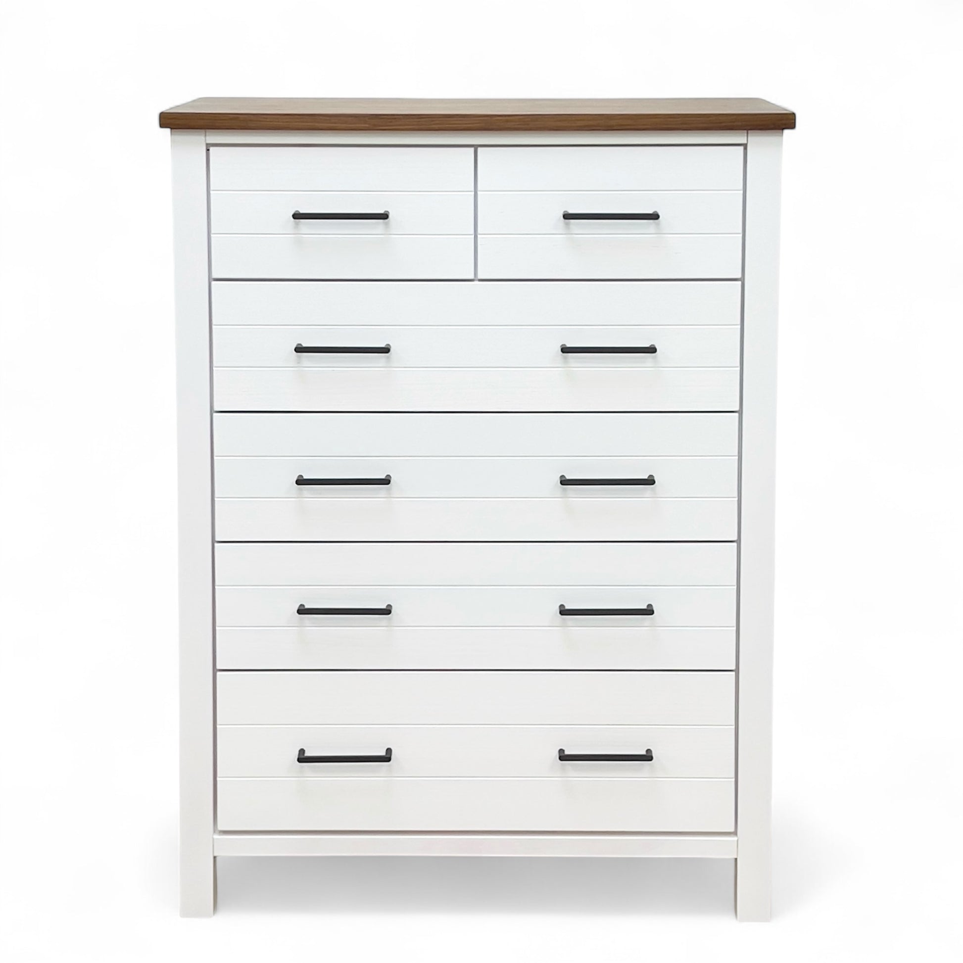 The Walton 6-Drawer Chest is a timeless storage solution that combines practicality with warm farmhouse-inspired style. Built with a solid white pine frame featuring a brushed wood grain finish and topped with solid rubber wood in a walnut stain, it delivers both durability and refined character.