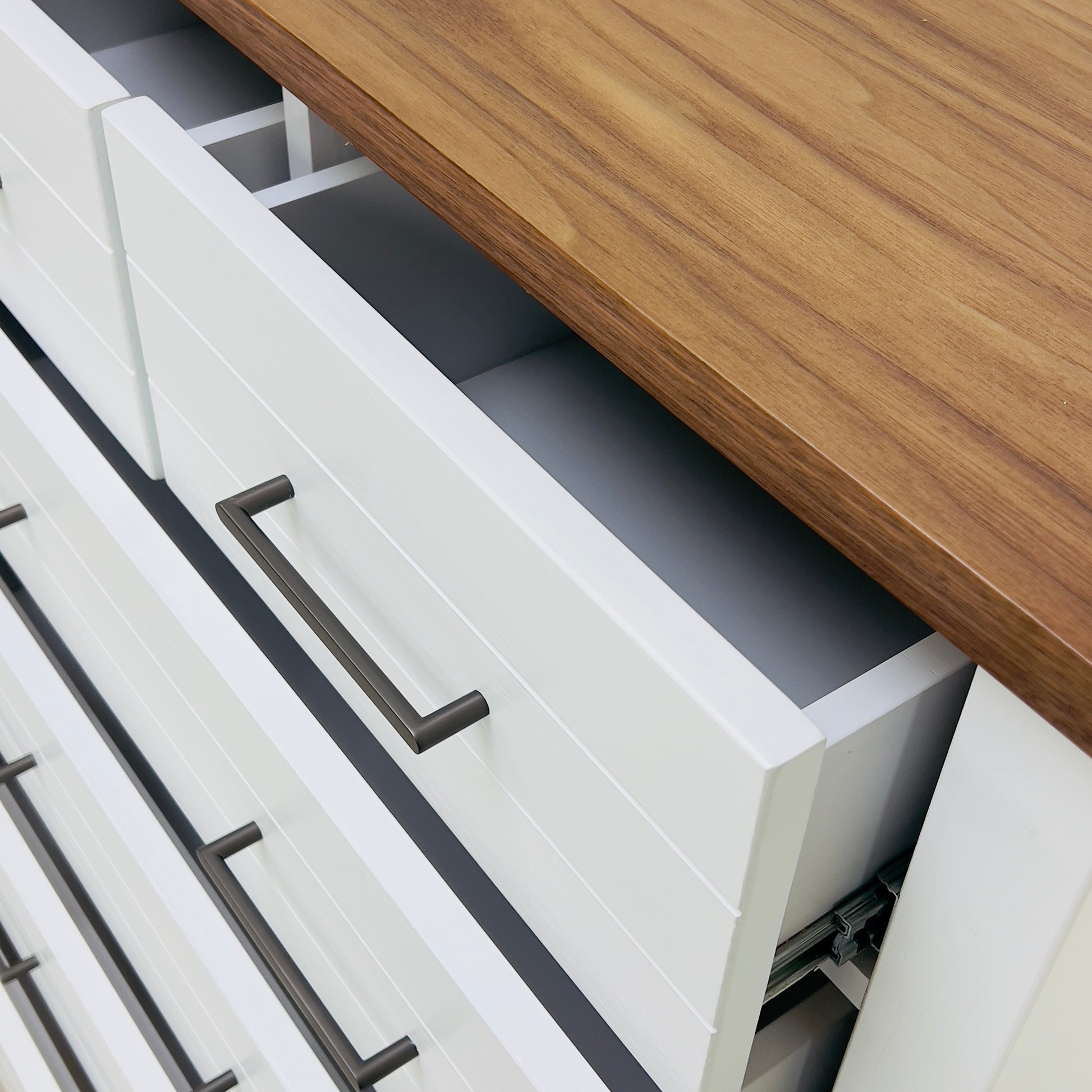 Its layout includes six drawers in a compact arrangement, giving you plenty of room for clothing, linens, or everyday essentials while maintaining an organized look. The walnut-finished top adds a rich contrast to the fresh white frame, making this chest a versatile piece that blends beautifully into bedrooms of both modern and classic styles.