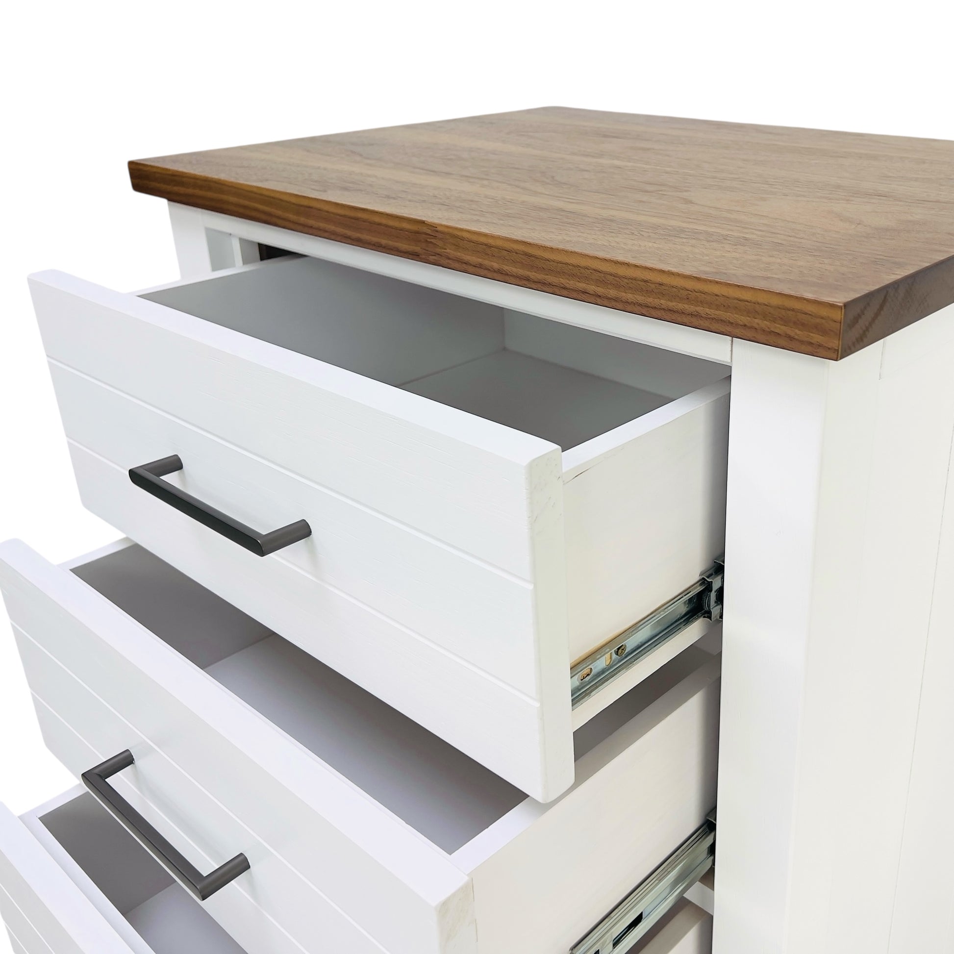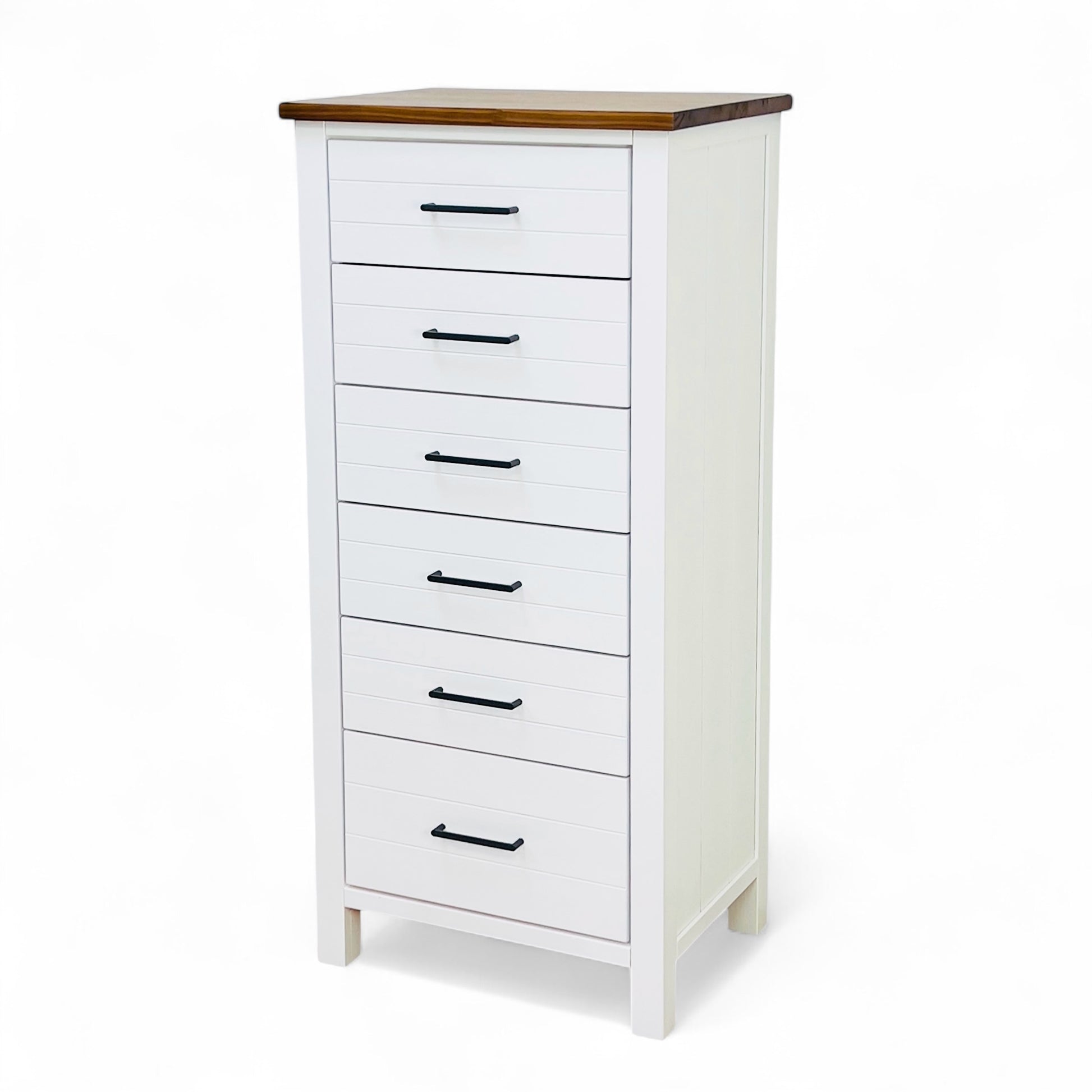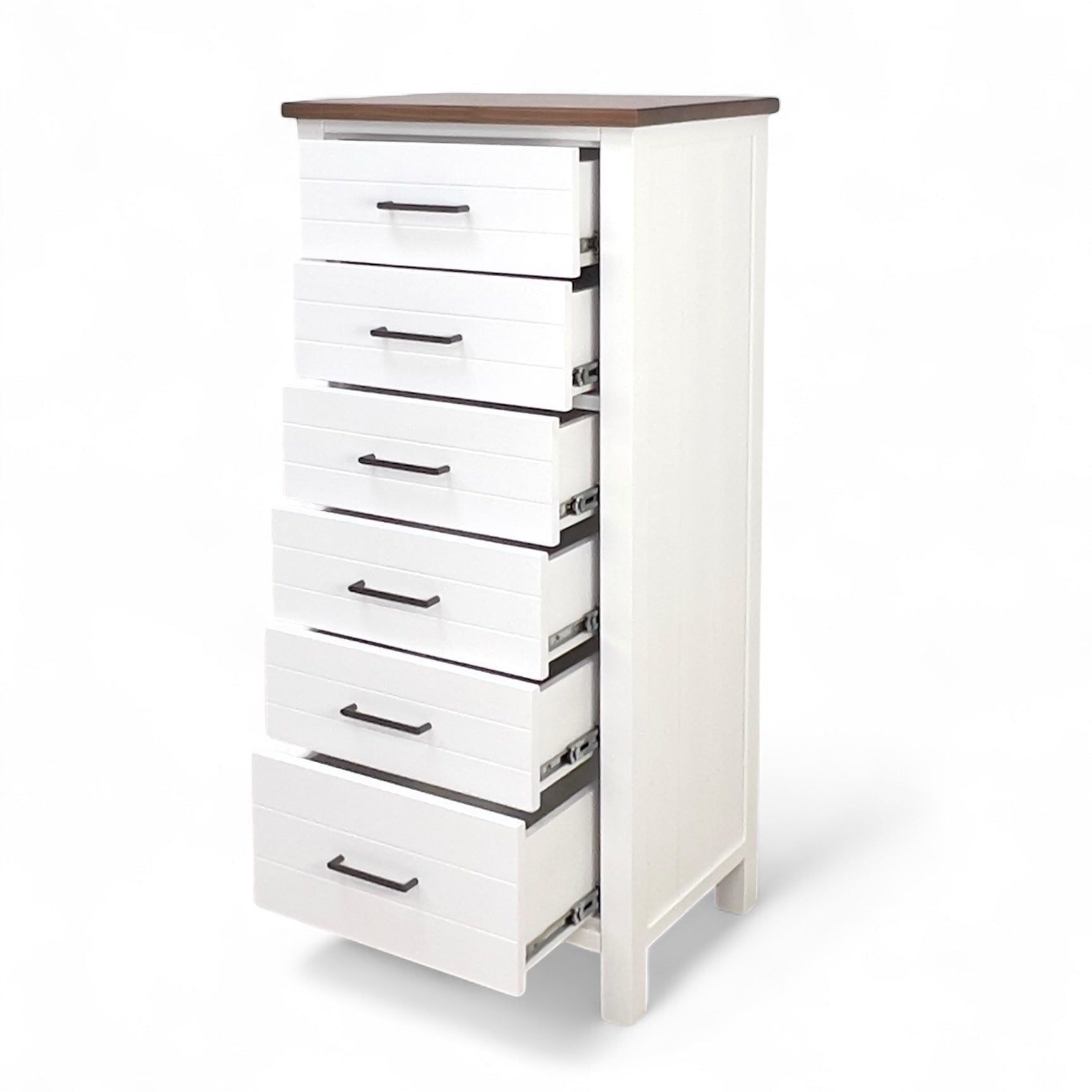The Walton Slim Boy offers a stylish and practical storage solution, designed with a compact footprint that fits perfectly into smaller spaces. Featuring a white pine body with a subtle brushed wood texture, paired with a walnut-colored rubber wood top, this tallboy captures a warm modern farmhouse look with a refined twist.