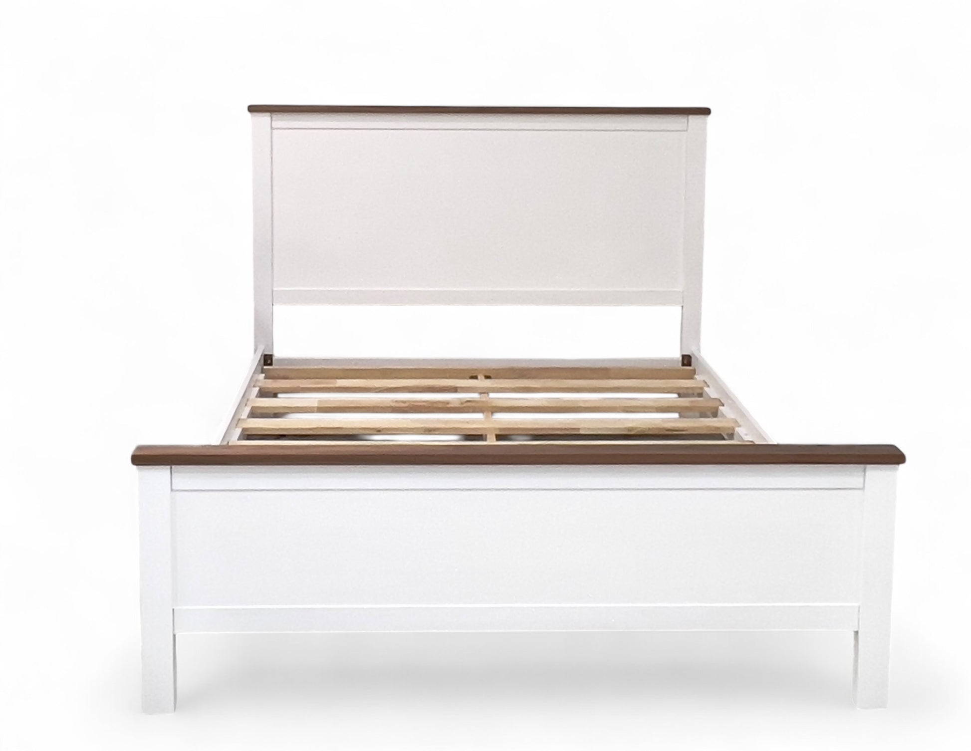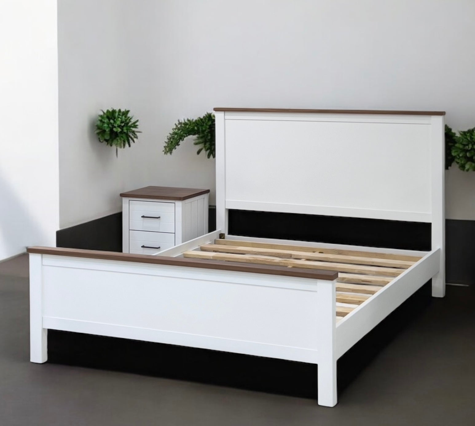 The Walton Queen Bed combines classic farmhouse charm with modern walnut sophistication, creating a timeless centerpiece for your bedroom. Built with a solid white pine frame in a brushed texture and finished with solid rubber wood trims in a rich walnut stain, it delivers both durability and style. Its clean lines and warm two-tone design make it versatile enough to complement both traditional and contemporary interiors.